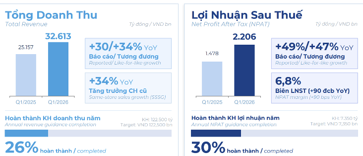 Điện Máy Xanh (DMX) vừa công bố kết quả kinh doanh quý I/2026 với mức tăng trưởng khả quan. Doanh thu thuần đạt 32.613 tỷ đồng, tăng 30% so với cùng kỳ, trong khi lợi nhuận sau thuế đạt 2.206 tỷ đồng, tăng 49%. Qua đó, doanh nghiệp đã hoàn thành khoảng 26% kế hoạch doanh thu và 30% mục tiêu lợi nhuận năm ngay trong quý đầu tiên.