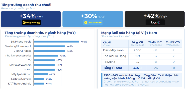 Cụ thể, ở trụ cột 1 tăng trưởng bằng chất, doanh thu các chuỗi ghi nhận tăng trưởng đồng đều như Thế Giới Di Động (+34%), Điện Máy Xanh (+30%), TopZone (+42%).