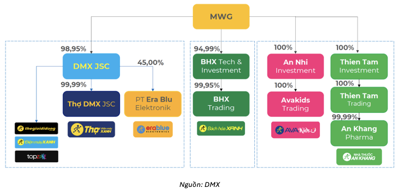 Trong đó, DMX được định vị là hệ sinh thái bán lẻ điện thoại – điện máy, bao gồm các chuỗi bán lẻ cốt lõi (Thế Giới Di Động, Điện Máy Xanh, TopZone) và các trụ cột tăng trưởng mới là dịch vụ Thợ DMX và liên doanh EraBlue tại Indonesia. Việc phân tách này được xem là cần thiết để DMX sở hữu một đội ngũ điều hành chuyên trách, vận hành minh bạch và sẵn sàng cho việc niêm yết độc lập.