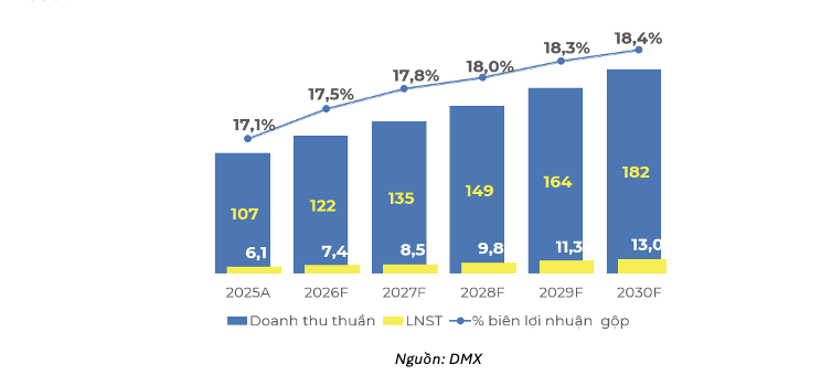 Trong tầm nhìn 5 năm tiếp theo (2026 - 2030), DMX dự phóng doanh thu sẽ đạt mức 182.000 tỷ đồng, tương đương tốc độ tăng trưởng kép 11%/năm. Đáng chú ý, nhờ sự đóng góp của các mảng dịch vụ (tài chính, hậu mãi) có biên lợi nhuận vượt trội, lợi nhuận ròng được dự báo tăng trưởng tốc độ 16%/năm, tiến tới mục tiêu nhân đôi lợi nhuận lên 13.000 tỷ đồng vào năm 2030.