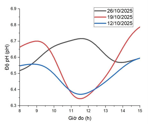 Ví dụ thực tiễn về kết quả hoạt động của thiết bị cảnh báo và giám sát nguồn nước tự động tại ấp Cầu Ngang, Xã Cần Đước, Tỉnh Tây Ninh cho thấy sự biến động giữa các ngày chủ yếu chịu ảnh hưởng của thời tiết, mưa – nắng và quá trình trao đổi nước trong ao.
