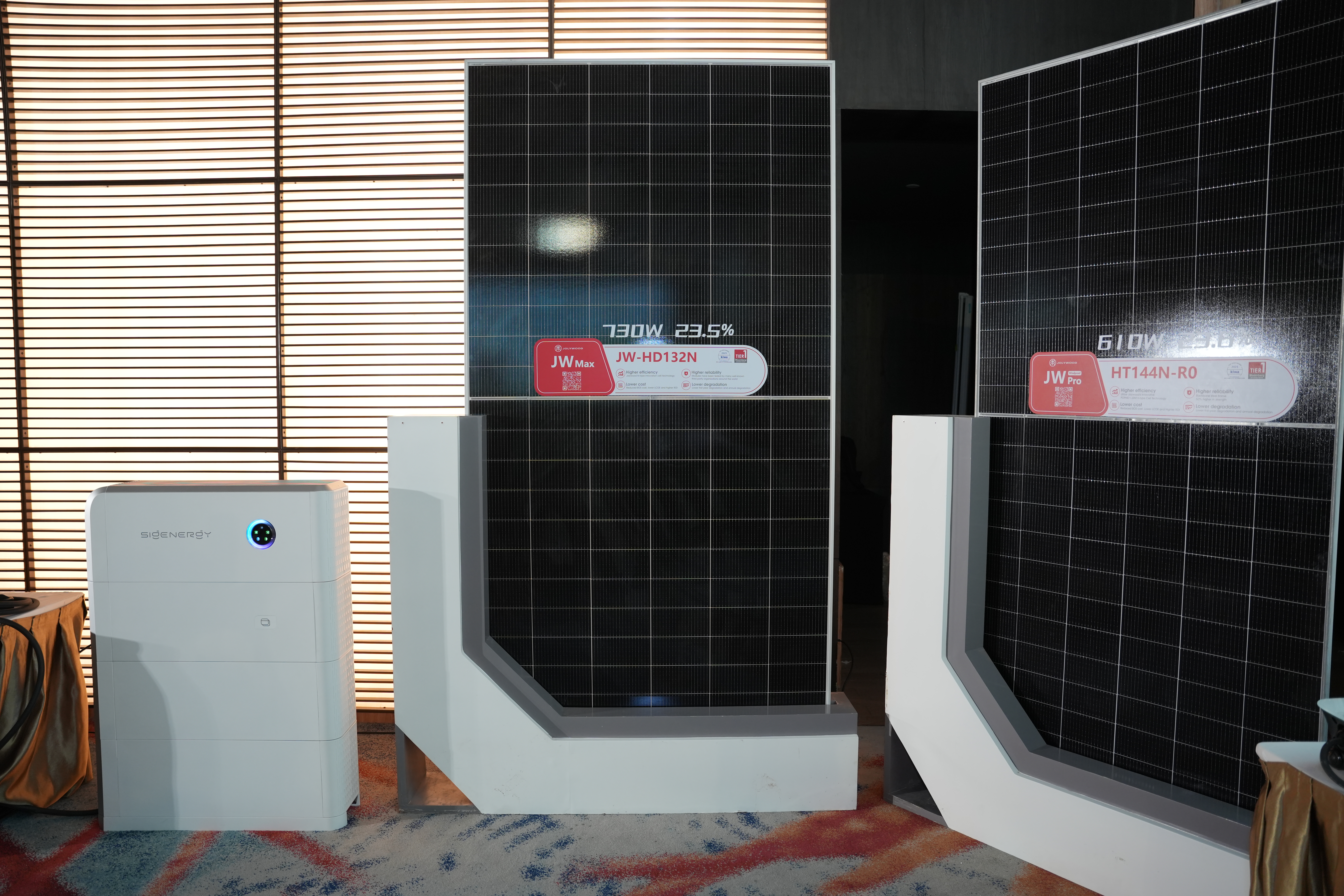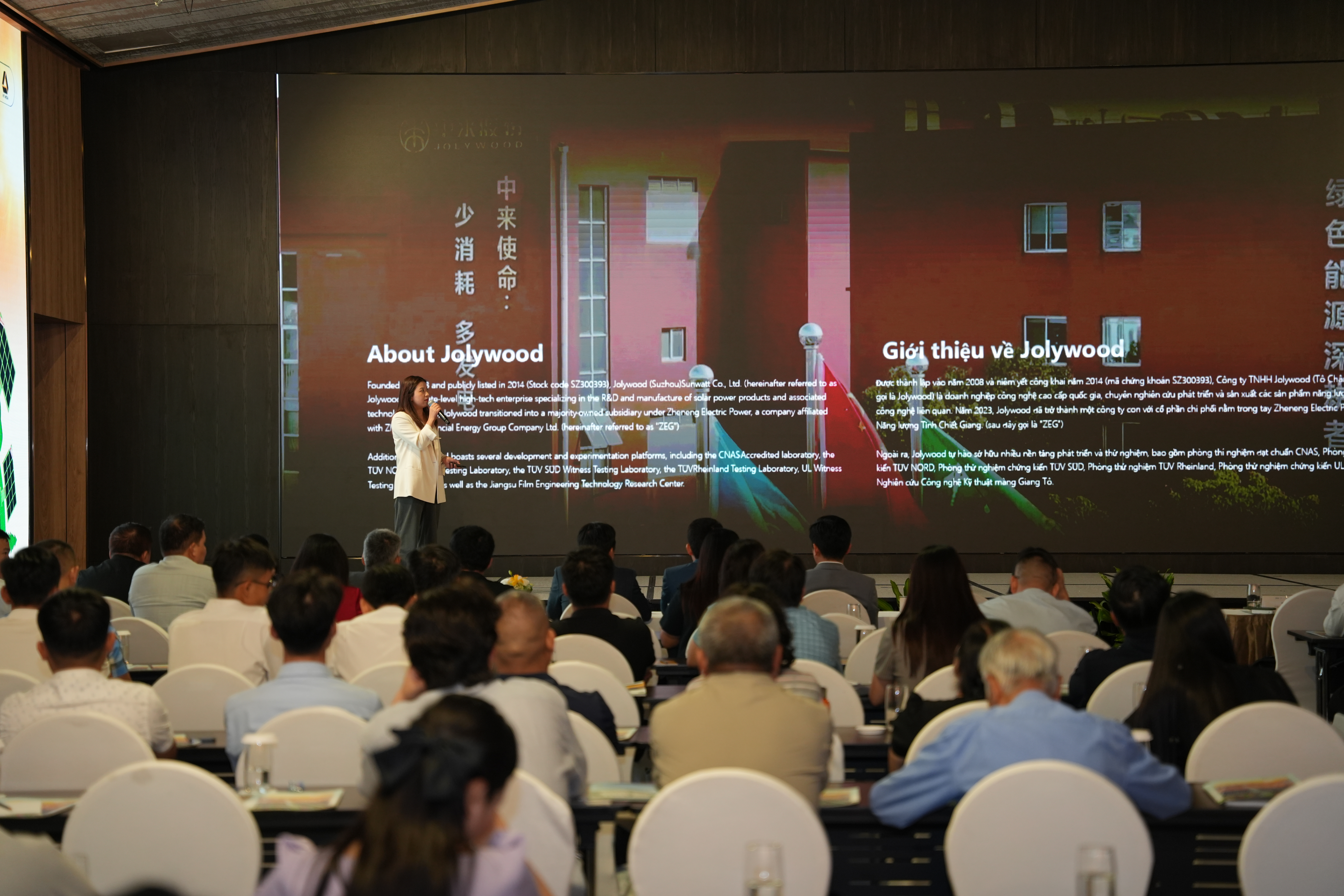 Trong khi đó, bà Ivy Lee, đại diện thương hiệu Jolywood mang đến hội thảo bài tham luận với chủ đề “Future-ready Innovation, Built to Last”, giới thiệu công nghệ tấm pin mặt trời mới với khả năng chắn gió và chống chịu thiên tai. Theo bà, đây là bước tiến quan trọng giúp nâng cao hiệu quả phát điện, đồng thời tăng độ bền và tính an toàn cho hệ thống, đặc biệt tại những khu vực thường xuyên chịu tác động từ biến đổi khí hậu như bão, mưa đá hay nhiệt độ khắc nghiệt như Việt Nam.