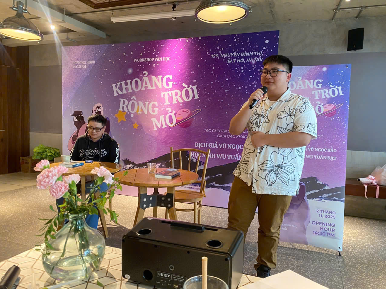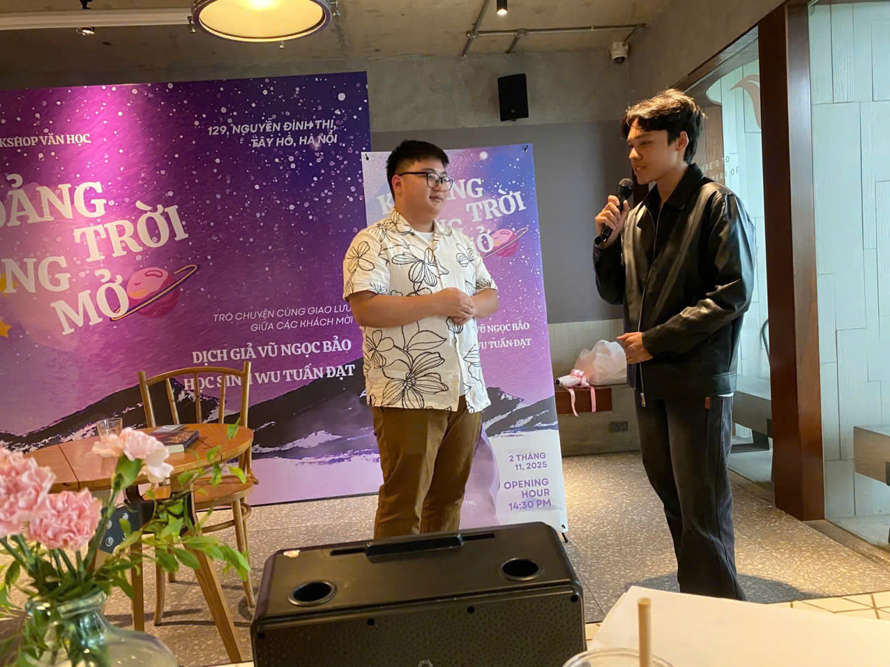 Dịch giả Vũ Ngọc Bảo (bên trái) và học sinh Wu Tuấn Đạt (bên phải) đều rất đam mê viết truyện viễn tưởng