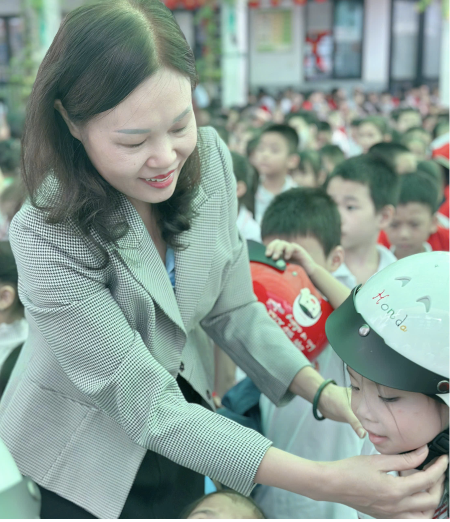 Học sinh rất hào hứng khi được cô Lê Thúy Hà – Bí thư chi bộ - Phó Hiệu trưởng đội mũ bảo hiểm.