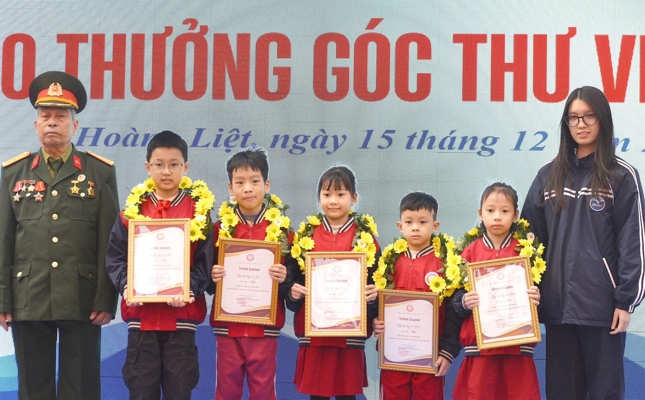 Ông ngoại cựu chiến binh Đặng Xuân Hồng và cây bút trẻ Nguyễn Kiều An trao giải cho đại diện các lớp học đạt giải cuộc thi “Thư viện xinh”