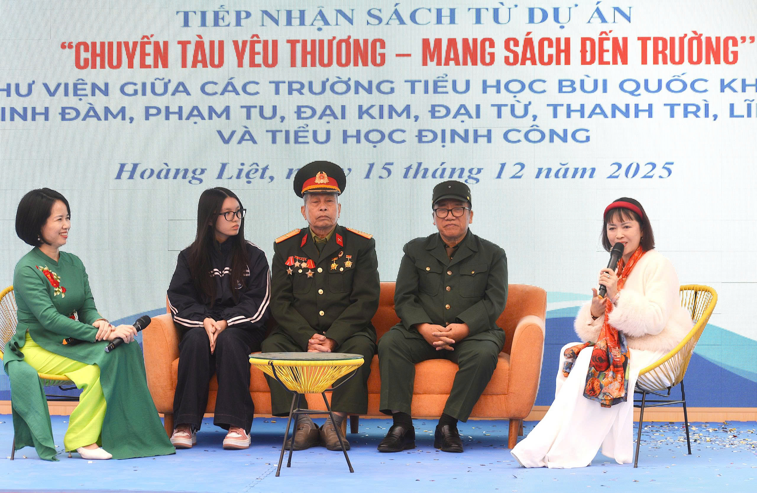 Ngày thứ hai đầu tuần (15/12/2025) với thật nhiều cảm xúc và ý nghĩa nhân văn, Trường Tiểu học Bùi Quốc Khái, Phường Hoàng Liệt, Hà Nội đón chào “Chuyến tàu Yêu thương - Mang sách đến trường”, giao lưu thư viện giữa 11 trường Tiểu học. Các vị hành khách đặc biệt trên chuyến tàu sách gồm có cựu chiến binh Đặng Xuân Hồng. Ông là nhân vật đương thời đã được cháu gái- tác giả trẻ Nguyễn Kiều An viết câu chuyện “Ông ngoại tôi- anh bộ đội cụ Hồ” giới thiệu trên ấn phẩm Trạm dừng yêu thương của Báo Thiếu Niên Nhi đồng, Nhà thơ Trần Đăng Khoa (Phó Chủ tịch Hội nhà văn Việt Nam), ông từng là người lính hải quân. Nhà thơ Bảo Ngọc- tác giả của nhiều trang thơ thiếu nhi trong sách giáo khoa cấp tiểu học và cây bút trẻ Nguyễn Kiều An (Học sinh lớp 11H, Trường THPT Chuyên ngữ Hà Nội).