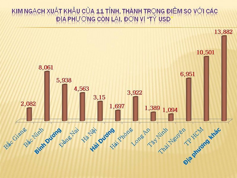 Với tổng kim ngạch lên tới gần 49,35 tỷ USD, 11 địa phương trọng điểm chiếm tới 78% tổng kim ngạch xuất khẩu cả nước trong quý I.