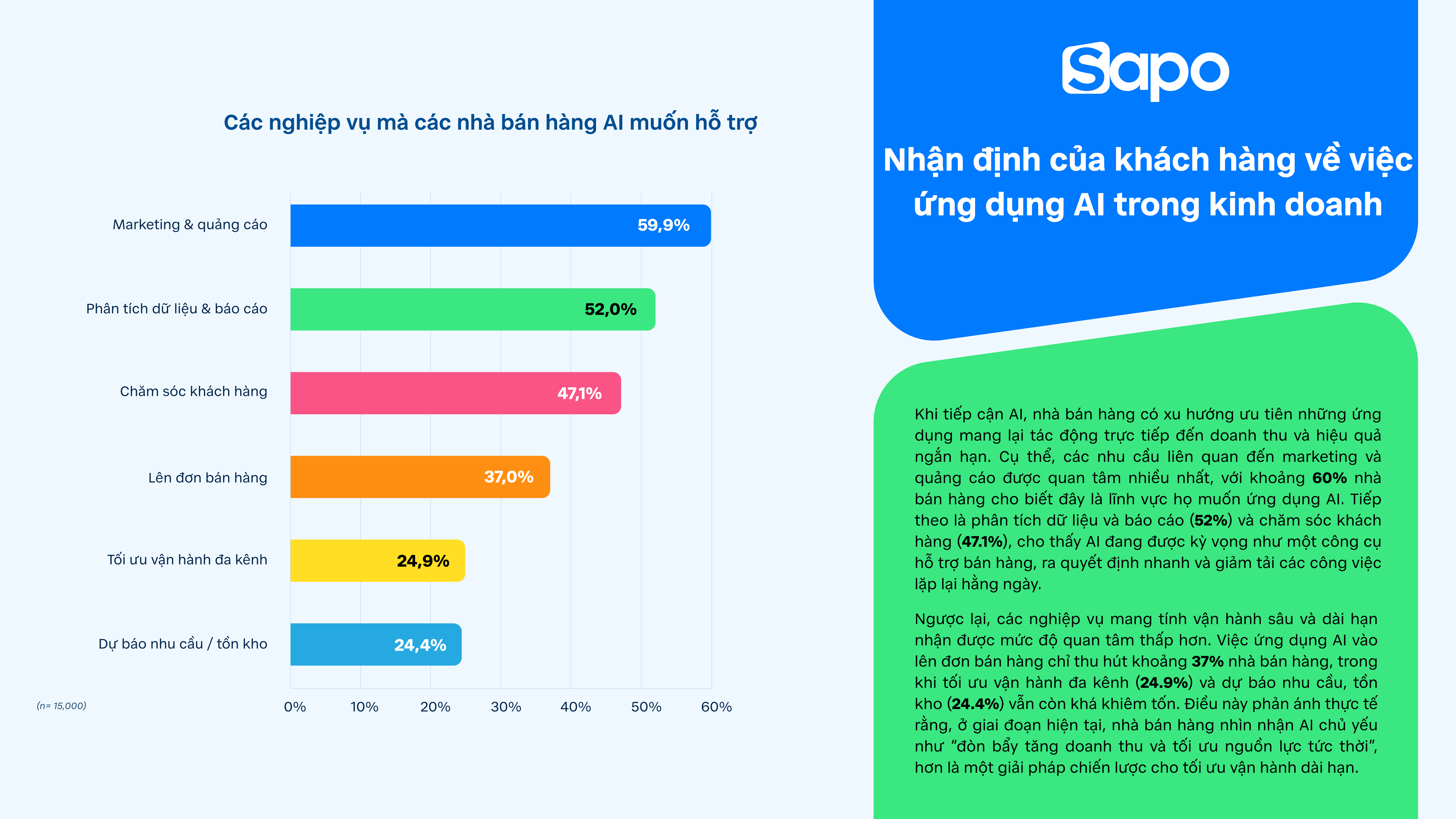 Khảo sát của Sapo cho thấy AI đang được nhà bán hàng nhìn nhận như một công cụ hỗ trợ trực tiếp cho doanh thu và mang lại hiệu quả ngắn hạn. Các nhóm công việc được ưu tiên ứng dụng AI nhiều nhất bao gồm marketing và quảng cáo (59,9%), phân tích dữ liệu và báo cáo (52,0%) và chăm sóc khách hàng (47,1%). Trong khi đó, các nghiệp vụ vận hành sâu hơn như tối ưu vận hành đa kênh (24,9%) hay dự báo nhu cầu và tồn kho (24,4%) nhận được mức độ quan tâm thấp hơn.