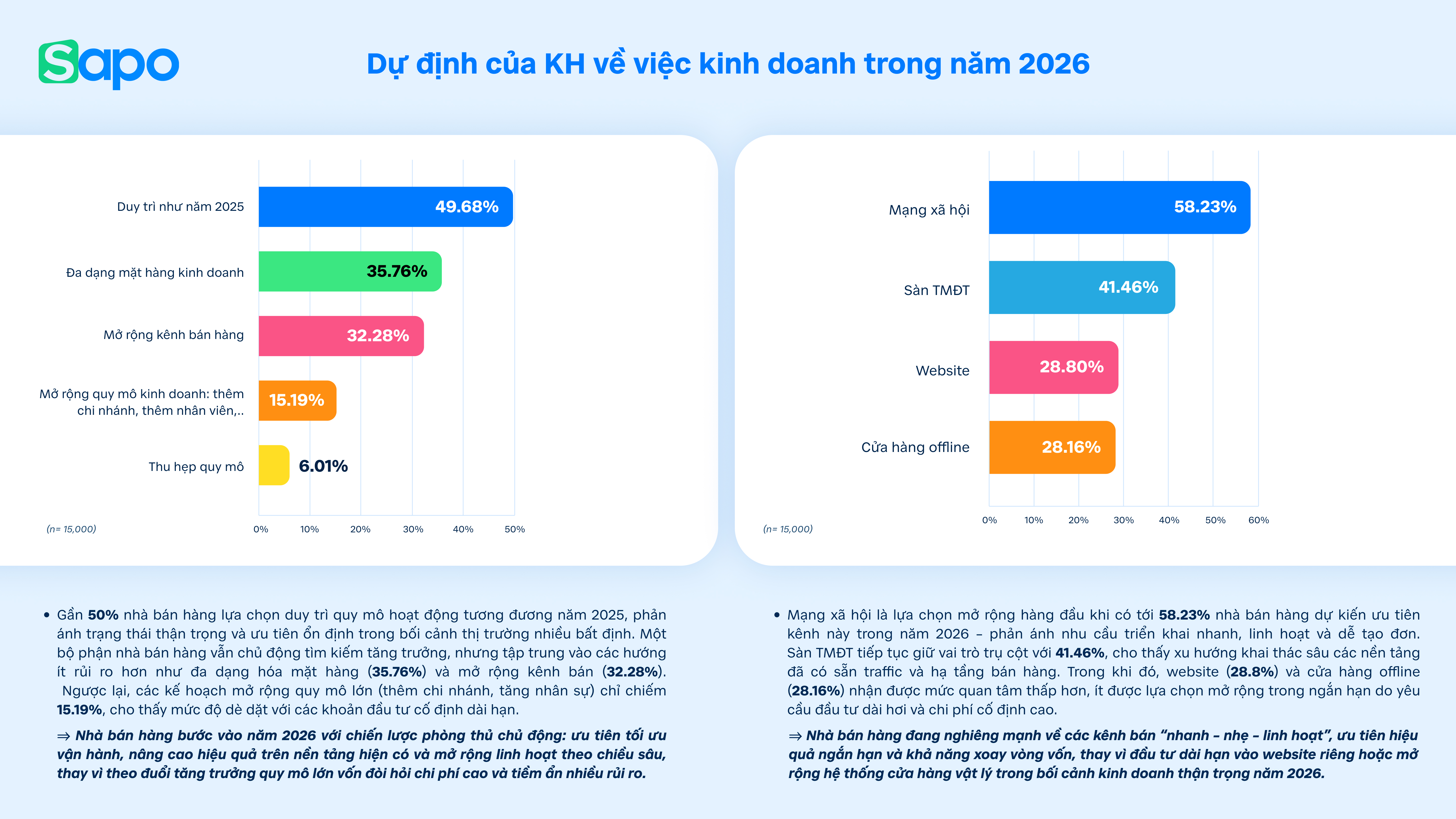 Bước sang năm 2026, thị trường bán lẻ Việt Nam sẽ chuyển từ giai đoạn mở rộng sang giai đoạn sàng lọc và chuẩn hóa. Khảo sát của Sapo cho thấy nhà bán hàng ngày càng thận trọng, ưu tiên duy trì và tối ưu hoạt động hiện tại hơn là tăng trưởng nóng. Trong bối cảnh hiện nay, khả năng vận hành đa kênh hiệu quả, kiểm soát dòng tiền, tuân thủ thuế và từng bước ứng dụng AI trong kinh doanh sẽ là những yếu tố quyết định ai có thể trụ vững và phát triển bền vững trong giai đoạn tiếp theo.